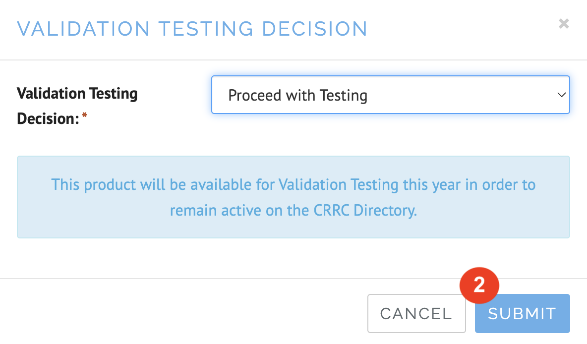 - Click the green “SUBMIT DECISION” button at the beginning of the Validation Testing year and select one of the following options: