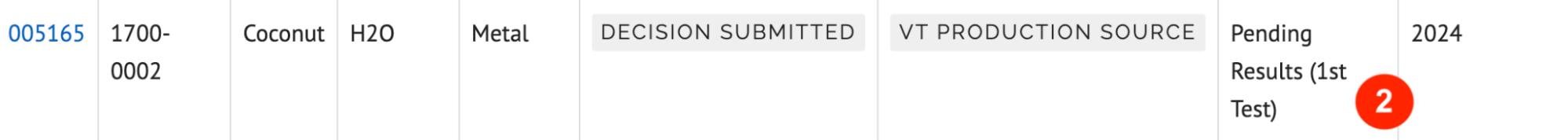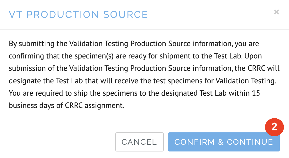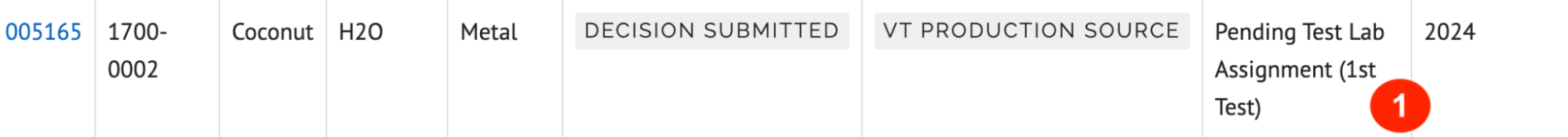 - When the VT Production Source is submitted, the Validation Testing Status is moved to “Pending Test Lab Assignment (1st Test)”. This lets CRRC Staff know to assign a Test Lab for Validation Testing.