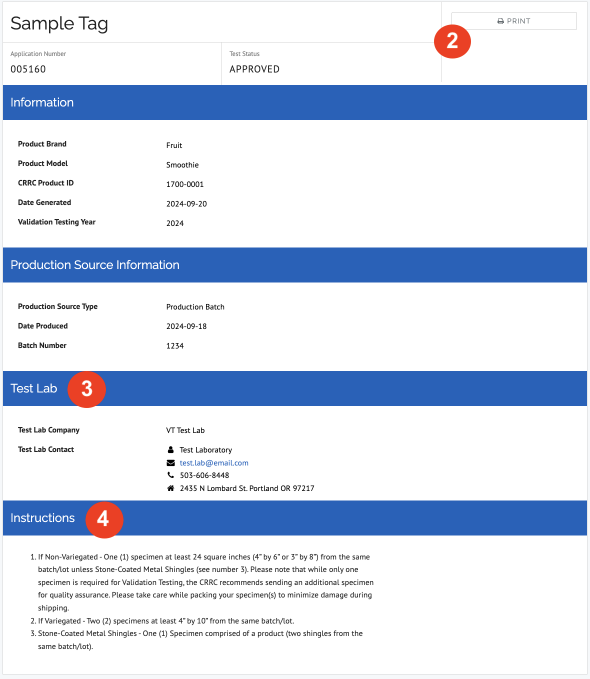 - If you have more than one product proceeding with testing, a separate Sample Tag must be printed for each product and included with the specimen(s) sent to the Test Labs.